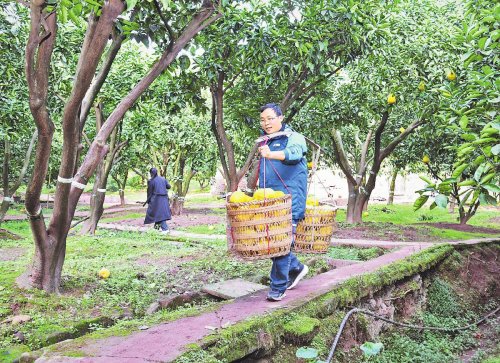 攬投員幫助農(nóng)戶(hù)將龍安柚挑出果園。