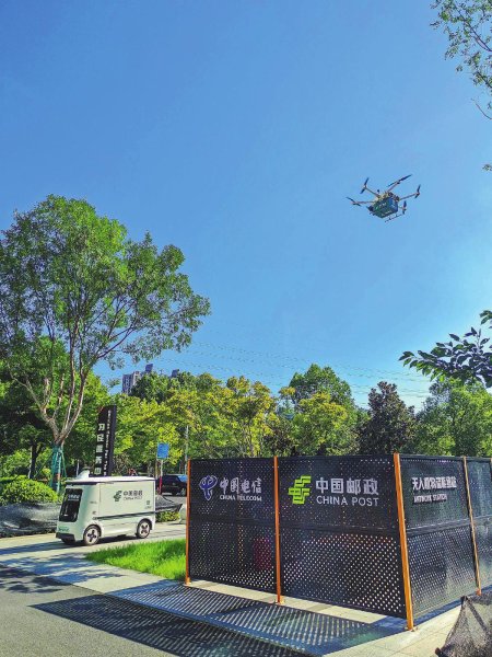 8月20日,在安徽省合肥市政務(wù)中心中國(guó)郵政無(wú)人機(jī)物流樞紐站,無(wú)人機(jī)啟程配送無(wú)人車送來(lái)的郵件。