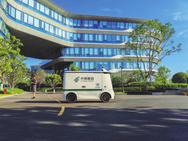 8月20日,在安徽省合肥市科大訊飛小鎮(zhèn),郵政無(wú)人車在配送郵件。