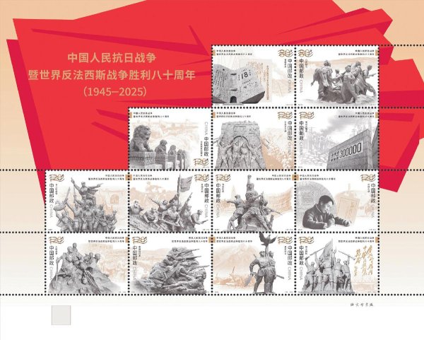 根據黨中央有關中國人民抗日戰爭暨世界反法西斯戰爭勝利80周年紀念活動安排,中國郵政于9月3日發行《中國人民抗日戰爭暨世界反法西斯戰爭勝利八十周年》紀念郵票1套13枚、小型張1枚,全套面值為20.8元。