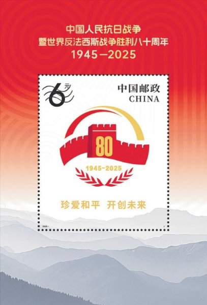 小型張使用中國人民抗日戰爭暨世界反法西斯戰爭勝利80周年紀念活動標識作為主景,主要表現“珍愛和平、開創未來”。