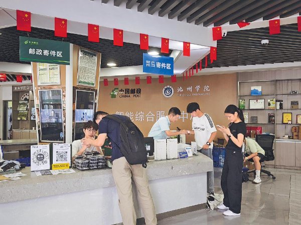 在安徽省池州市全國唯一全徽派建筑風格的高校——池州學院里,白墻黛瓦映著初秋晨光,占地近2000畝的校園里生活著1.8萬名師生。承載著校園郵政服務與多元便民功能的池州學院郵政智能綜合服務中心,以“一站式”便捷服務姿態,成為開學季里師生離不開的“暖心樞紐”。