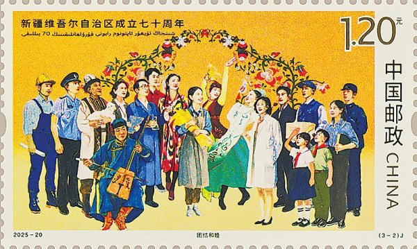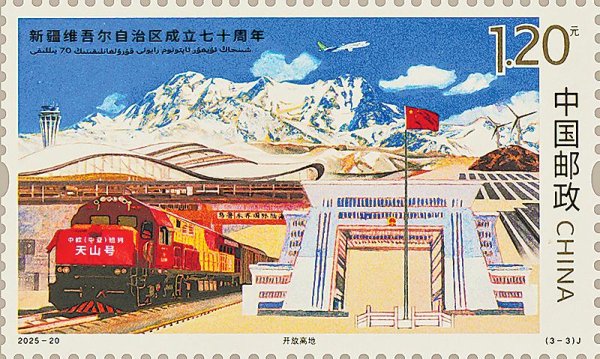 郵票圖案采用巖彩繪畫(huà)技法創(chuàng)作。第一枚“美麗新疆”,畫(huà)面主體為新疆城市美景,前景綻放的玫瑰代表塔克拉瑪干沙漠“鎖邊”工程,背景為昆侖山慕士塔格峰和卡拉庫(kù)里湖。第二枚“團(tuán)結(jié)和睦”,畫(huà)面表現(xiàn)了新疆各民族、各行業(yè)群眾團(tuán)結(jié)和諧、親如一家的場(chǎng)景。第三枚“開(kāi)放高地”,畫(huà)面以中歐班列、霍爾果斯國(guó)門(mén)為主體,遠(yuǎn)景展現(xiàn)了烏魯木齊國(guó)際機(jī)場(chǎng)、光伏電站和博格達(dá)峰。郵票充分展現(xiàn)了在新疆這片美麗、廣袤的土地上,傳統(tǒng)與現(xiàn)代交織,自然與人文共生,古老與青春共舞;生動(dòng)描繪了各族群眾獲得感、幸福感、安全感不斷增強(qiáng)的美好圖景,各族群眾像石榴籽一樣緊緊抱在一起,在中國(guó)式現(xiàn)代化進(jìn)程中更好建設(shè)團(tuán)結(jié)和諧、繁榮富裕、文明進(jìn)步、安居樂(lè)業(yè)、生態(tài)良好的美麗新疆。