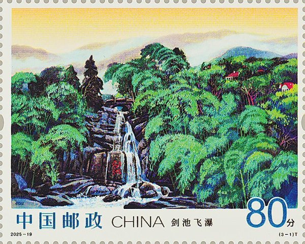 第一枚“劍池飛瀑”(見圖),敘述了莫干山的古老傳說。郵票畫面聚焦劍池瀑布自蒼崖飛瀉而下的剎那,與周邊環繞的茂林翠柏、蒼巖石壁共同講述干將、莫邪鑄劍的傳奇故事。第二枚“群墅點翠”,呈現了莫干山的建筑風貌。此枚郵票將掩映在翠竹間眾多風格各異的別墅盡收眼底,別墅群落依山就勢,錯落層疊,紅瓦青磚與修竹勁松相映成趣。第三枚“旭光云海”,描繪了莫干山的日出景象。該枚郵票定格了莫干山旭日東升的壯麗景象,旭光臺作為莫干山觀賞日出的絕佳觀景臺,將天地交輝的盛景盡收眼底。