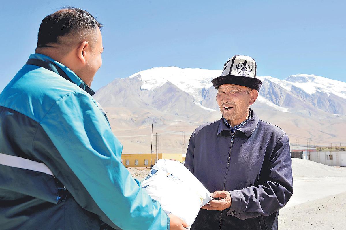 阿克陶縣郵政分公司投遞員阿不都賽米·賽買提為當地村民送包裹上門。