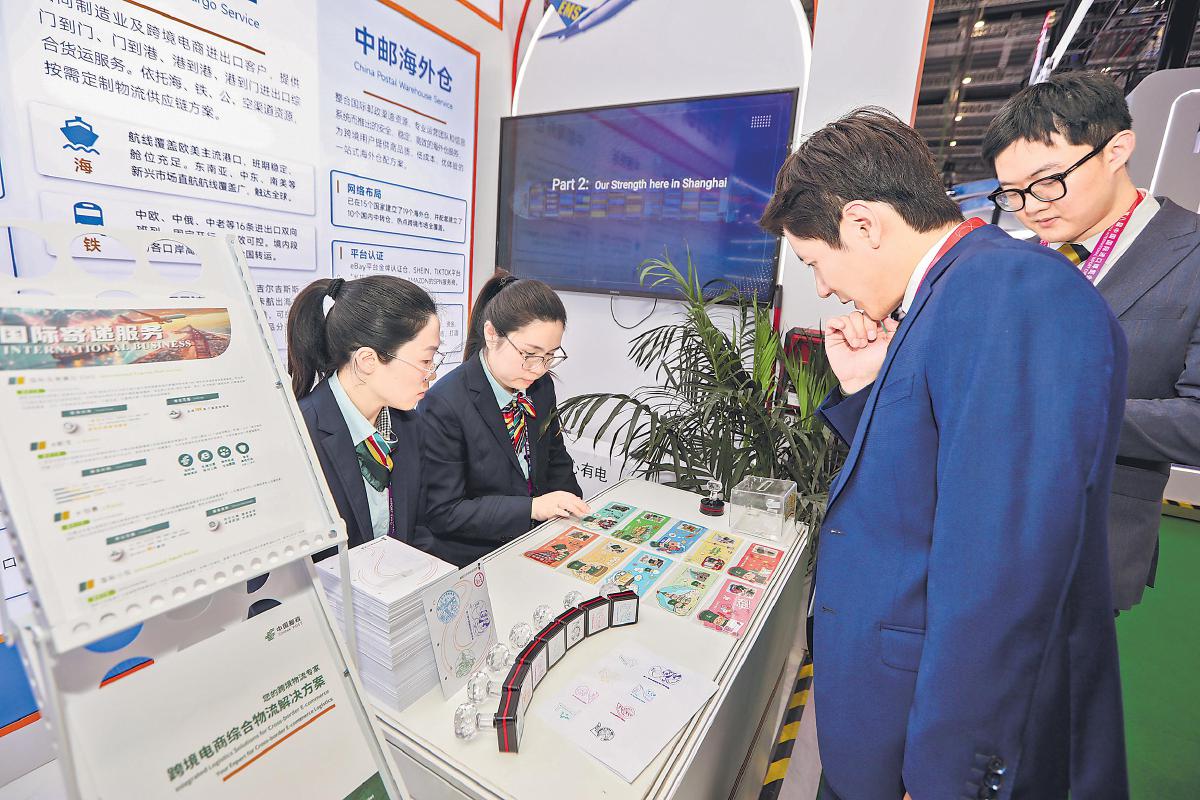 11月5日—10日,第八屆中國(guó)國(guó)際進(jìn)口博覽會(huì)(以下簡(jiǎn)稱“進(jìn)博會(huì)”)在上海舉行。本屆進(jìn)博會(huì)有155個(gè)國(guó)家、地區(qū)和國(guó)際組織參與,4108家境外企業(yè)參展,規(guī)模再創(chuàng)新高。上海市郵政分公司特為本屆進(jìn)博會(huì)啟用并發(fā)行了《第八屆中國(guó)國(guó)際進(jìn)口博覽會(huì)》YFM118E型郵資機(jī)戳和紀(jì)念封各1枚,受到廣大集郵愛好者和參展觀眾的歡迎。同時(shí),中國(guó)郵政EMS連續(xù)第八年受邀參展,展示了其全球寄遞網(wǎng)絡(luò)、境外倉(cāng)配矩陣等六大板塊成果,呈現(xiàn)郵政從“郵商并舉”向“郵商貨倉(cāng)并進(jìn)”的轉(zhuǎn)型路徑,為跨境貿(mào)易提供全鏈條解決方案。圖為觀眾被EMS展位上的特色明信片所吸引。