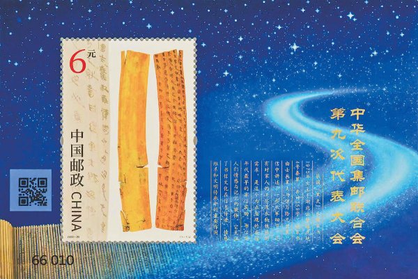 小型張圖案表現了“黑夫木牘”。該木牘1975年出土于湖北省云夢縣睡虎地4號秦墓,是目前考古發現的最早家書,延續了中華全國集郵聯合會大會系列郵票以郵驛文化元素為表現內容的慣例。該家書由士兵黑夫與驚寫給兄長衷,信中講述了一些從軍細節,還有對家人的關懷及衣物錢糧的需求。邊飾背景中展開的竹簡似一條時光長河,在象征中華文明的浩瀚星空里蜿蜒伸展,穿越千年、對話古今,蘊含了中華文明在傳承中創新、在創新中發展的思想智慧。