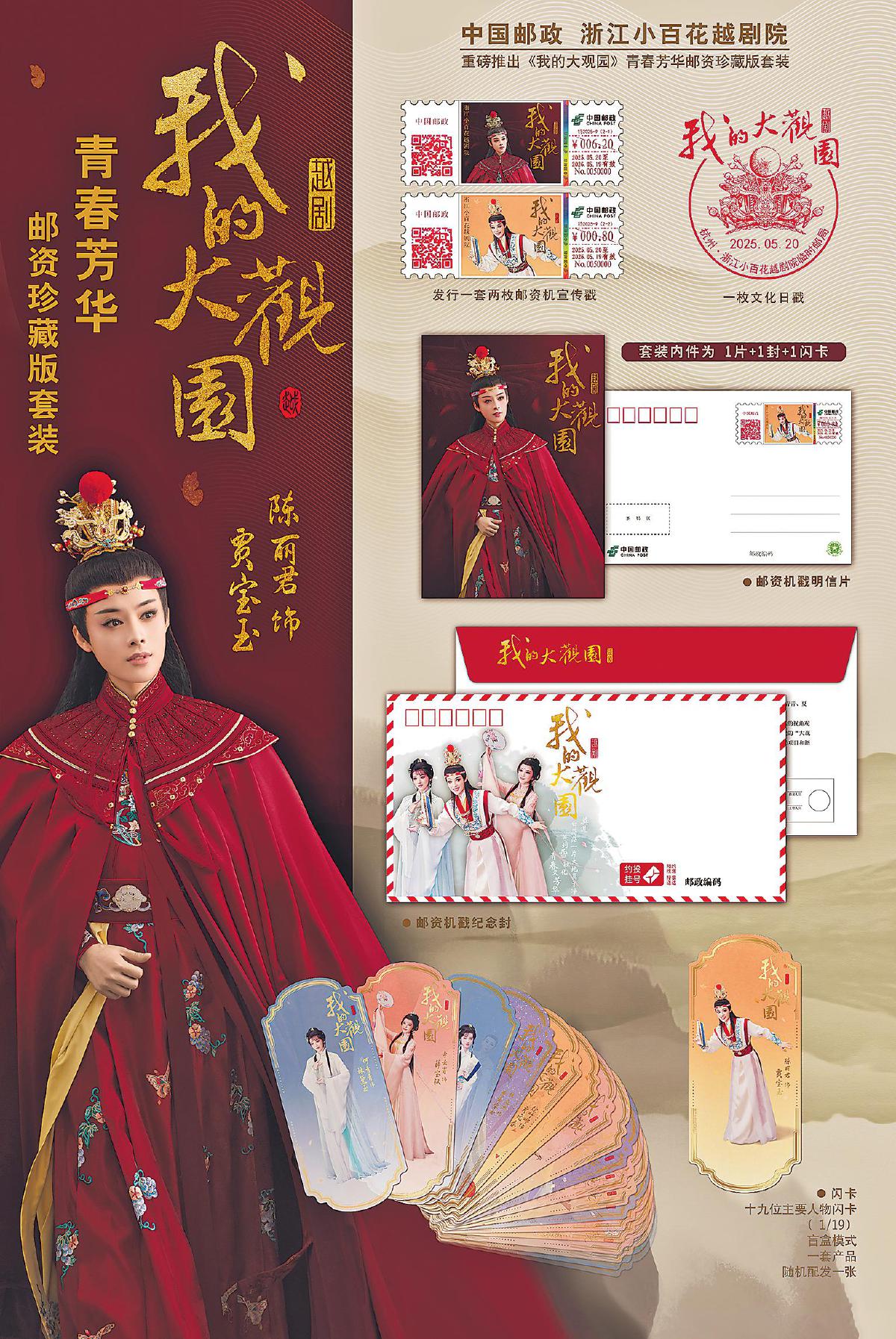 “在和浙江小百花越劇院溝通時,我們圍繞《我的大觀園》進行產品的創新設計:以主角形象為核心元素打造系列封片產品,并將19位主要演員的風采制成收藏級閃卡。這份寄給廣大戲迷的獨特禮物,兼具文化傳播與文創收藏價值,讓越劇之美觸手可及。這一創意得到浙江小百花越劇院的認可。他們覺得這對于這部劇的宣傳以及對于越劇文化的傳播都是非常有益的。”浙江省分公司郵政業務部函包業務室主任陳志皓介紹道。