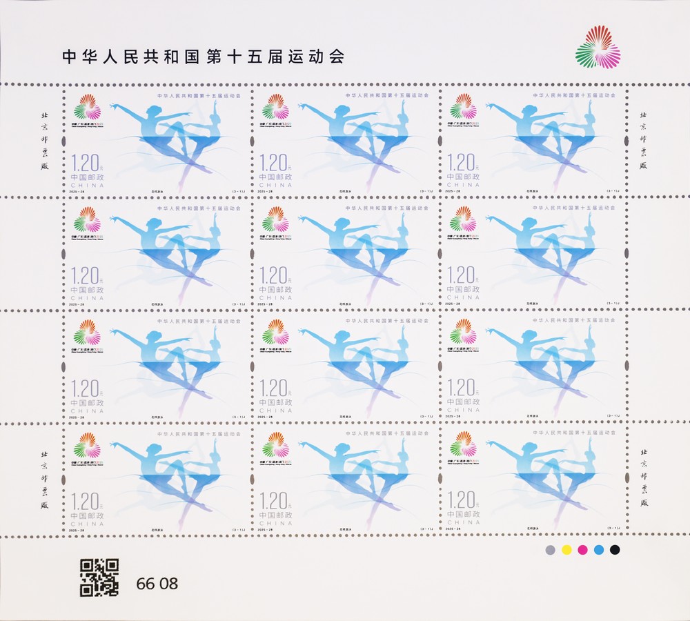 中國郵政定于2025年11月9日發(fā)行《中華人民共和國第十五屆運動會》紀念郵票1套3枚,郵票圖案名稱為:花樣游泳、擊劍、乒乓球。全套郵票面值3.60元,計劃發(fā)行數(shù)量為套票500萬套,版式二69.3萬版。