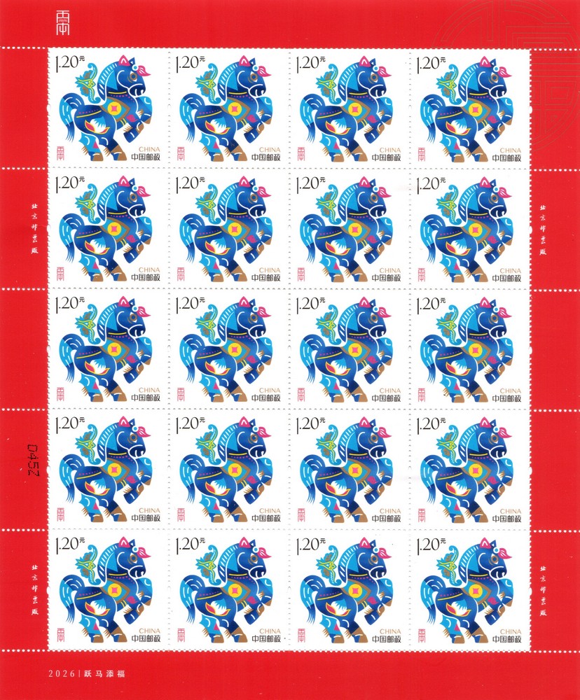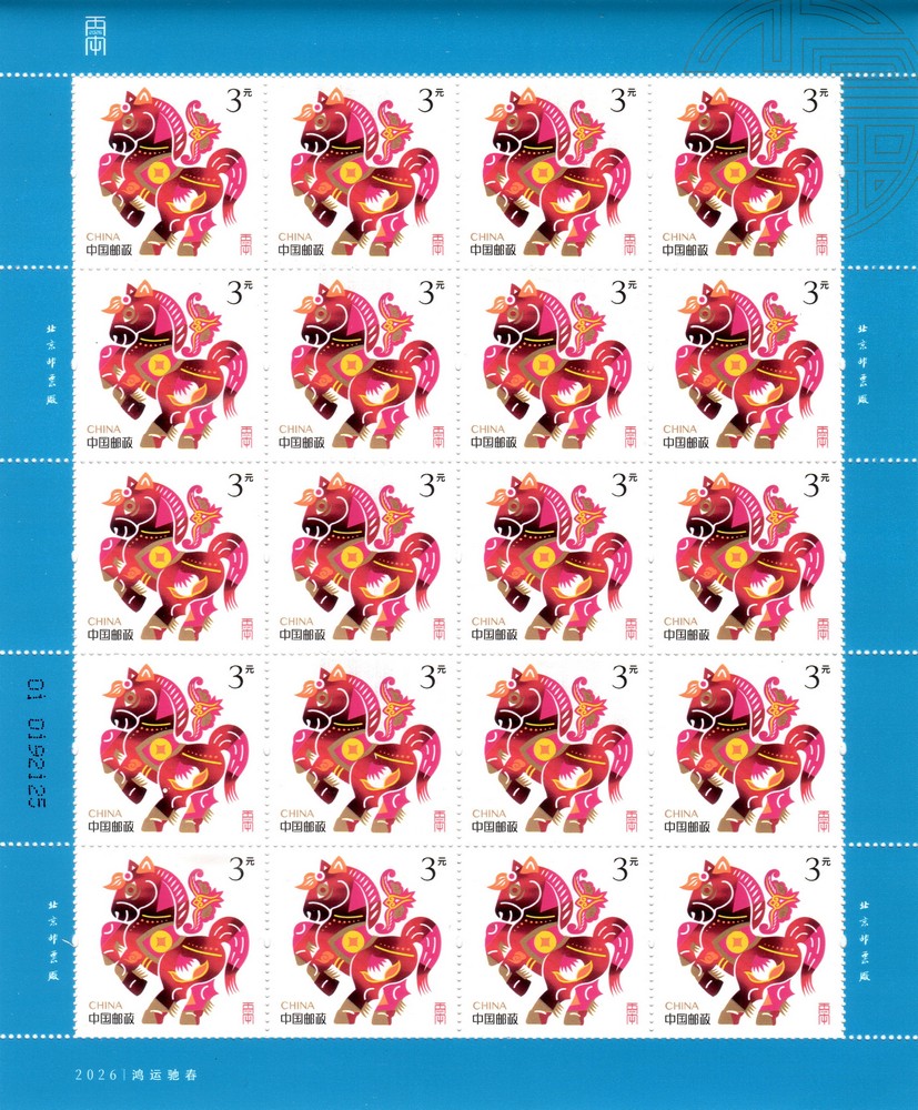 注:采用“躍馬添福”和“鴻運馳春”郵票印制小全張1枚,規(guī)格為120×190毫米。小全張專用于2026年中國郵政賀年有獎產品(祝福卡型15元)。